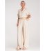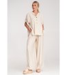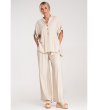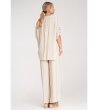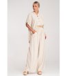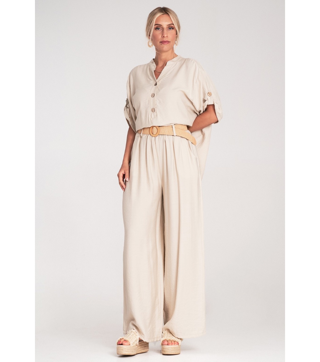 Set format din două piese, format dintr-o cămașă și pantaloni. Cămașa are decolteu în V și închidere cu nasturi. Mânecile sunt 3/4 și pot fi suflecate. Pantalonii au o croială largă, talie elastică și buzunare laterale. Setul include o curea tricotată cu cataramă decorativă.