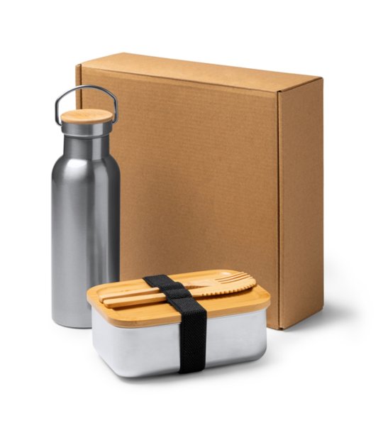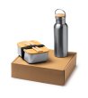 Stamina Set cutie de prânz și sticlă BAGNER Set cutie de prânz cu tacâmuri și sticlă. Cutie de prânz fabricată din oțel inoxidabil 304, cu o capacitate de 800 ml și capac din bambus cu bandă elastică.