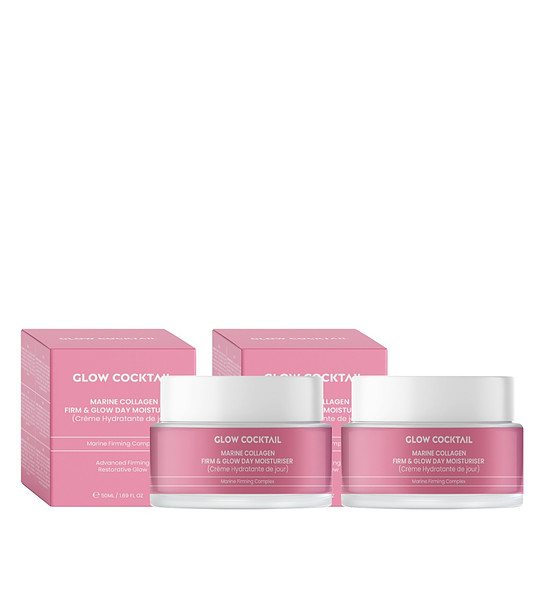 Glow Cocktail London Set de 2 creme de zi cu colagen marin pentru fermitate și strălucire 50 ml • Textură ușoară cu colagen marin care hidratează intens, susține elasticitatea și estompează vizibil liniile fine.