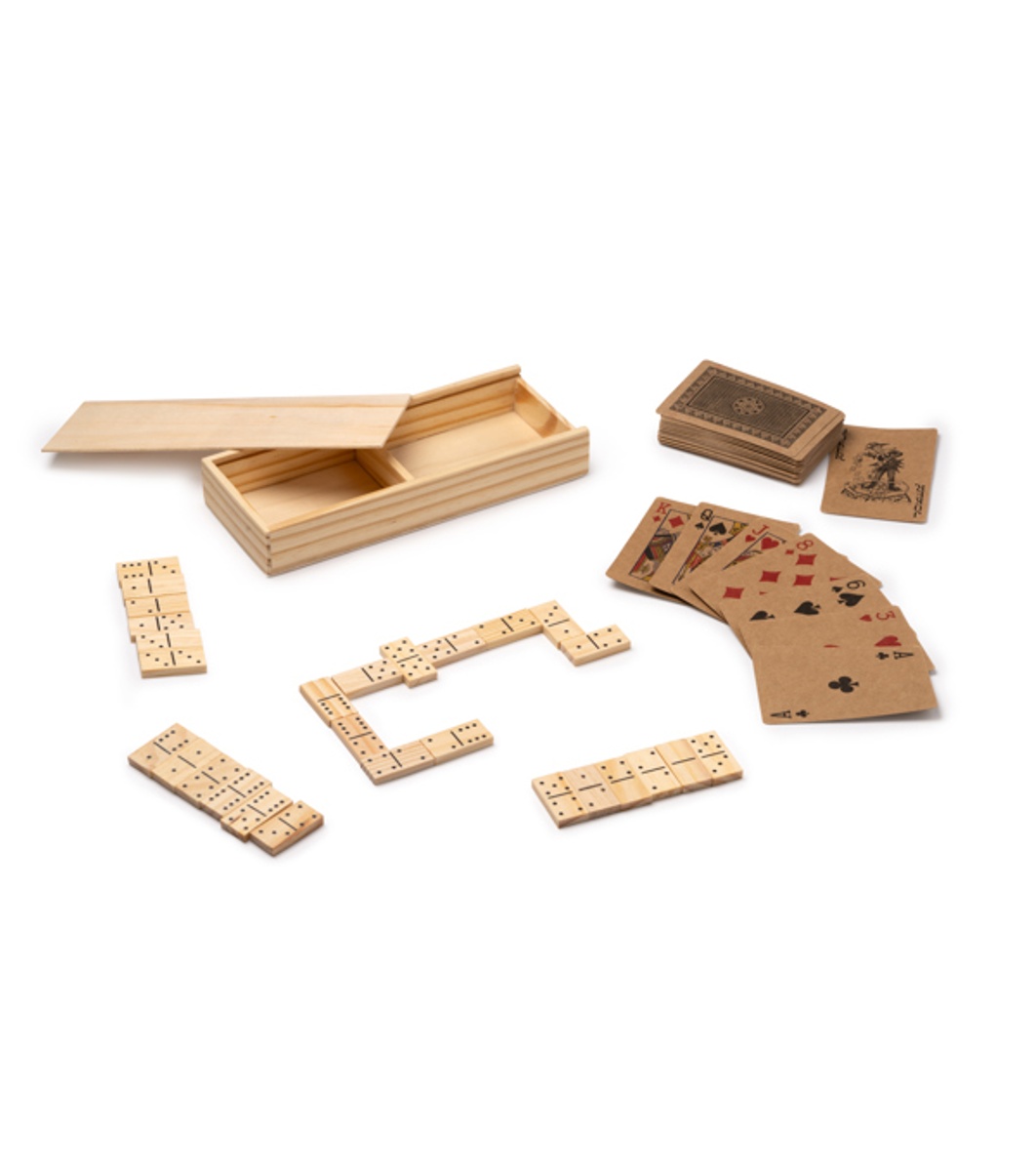 Set de 2 jocuri: pachet de cărți din carton reciclat și domino din lemn