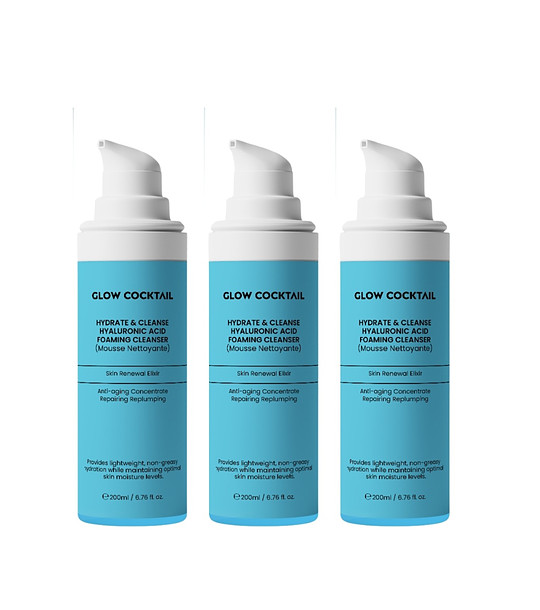 Glow Cocktail London Set de 3 geluri hidratante și de curățare cu acid hialuronic 200 ml • Gel hidratant și de curățare gel de curățare spumant cu acid hialuronic