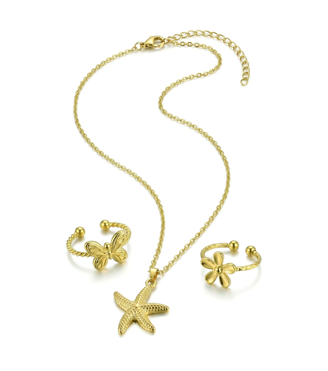 Victoria Walls Set de bijuterii din oțel inoxidabil auriu pentru femei cu stea de mare Colier și set de două inele