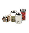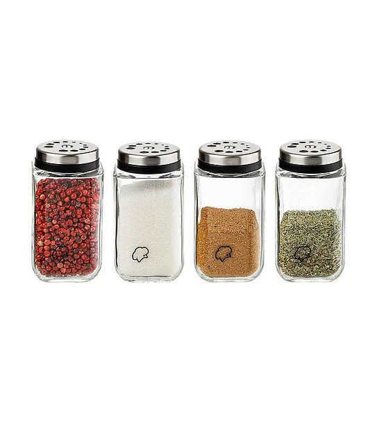 Setul contine: borcan de condimente - 4 bucati cu o capacitate de 180ml dimensiuni borcan: 5,6x5,6x10,6cm Cantitatea de condimente poate fi ajustata prin rotirea capacelor metalice si alegand dimensiunea deschiderii potrivite momentului suport metalic pentru depozitare din otel inoxidabil sau organizat, pe un blat din otel inoxidabil si rezistent bsp;
