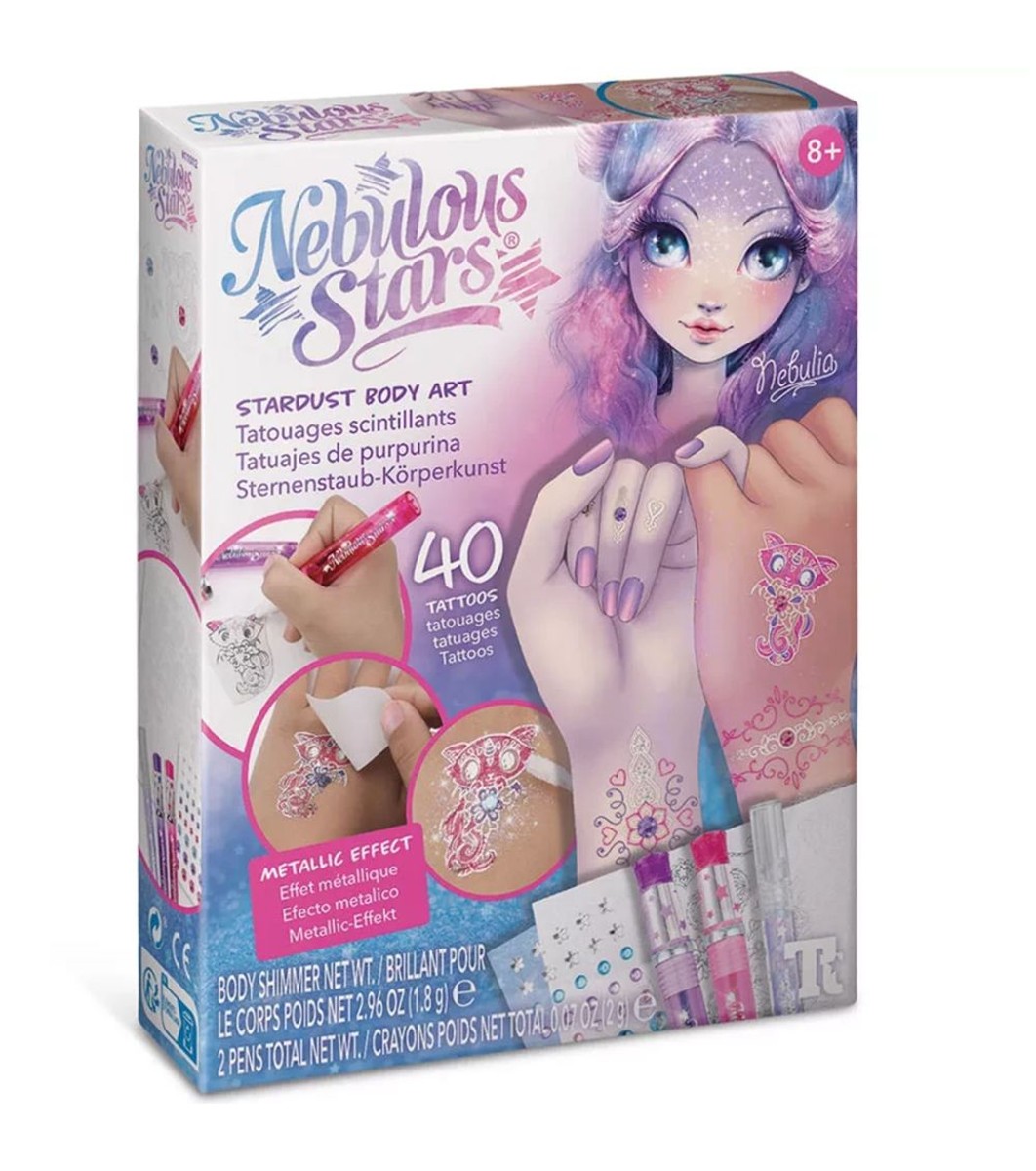 Strălucește ca o stea cu kitul creativ pentru corp Nebulous Stars! Folosește tatuajele temporare din kit pentru a-ți decora corpul cu modele frumoase și cosmice! Stilourile metalice pentru tatuaje și autocolantele cu cristale te vor ajuta să adaugi strălucire tatuajelor tale!