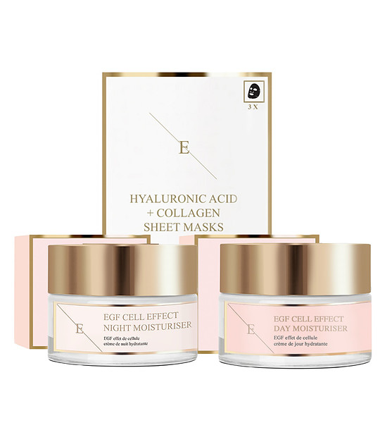 • Trei măști hidratante luxoase, cu efect de 30 de minute, cu o formulă inovatoare ce conține acid hialuronic, colagen, extract de alge și trei extracte naturale bogate în antioxidanți. Conceput pentru a hidrata, hrăni și revitaliza pielea deshidratată și ternă. Se utilizează înainte de machiaj, la un eveniment special sau ca tratament săptămânal de relaxare și hidratare.