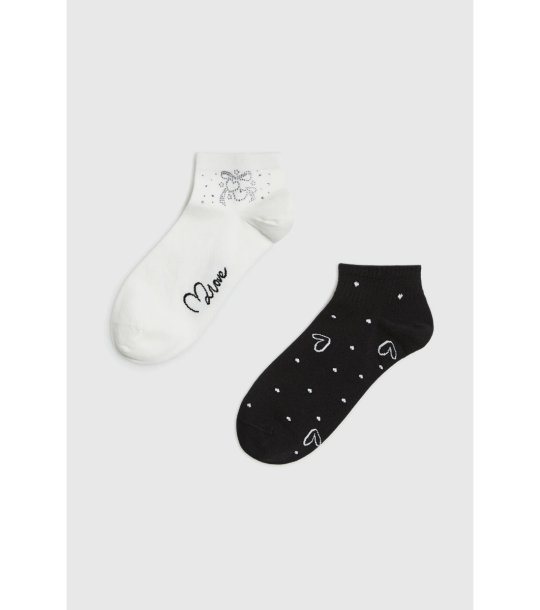 Moodo Set de șosete scurte de damă cu imprimeu Set de două perechi de șosete joase de damă cu modele diferite. O pereche are un imprimeu cu buline și inimioare, iar cealaltă are o inscripție și un motiv decorativ în partea de sus.