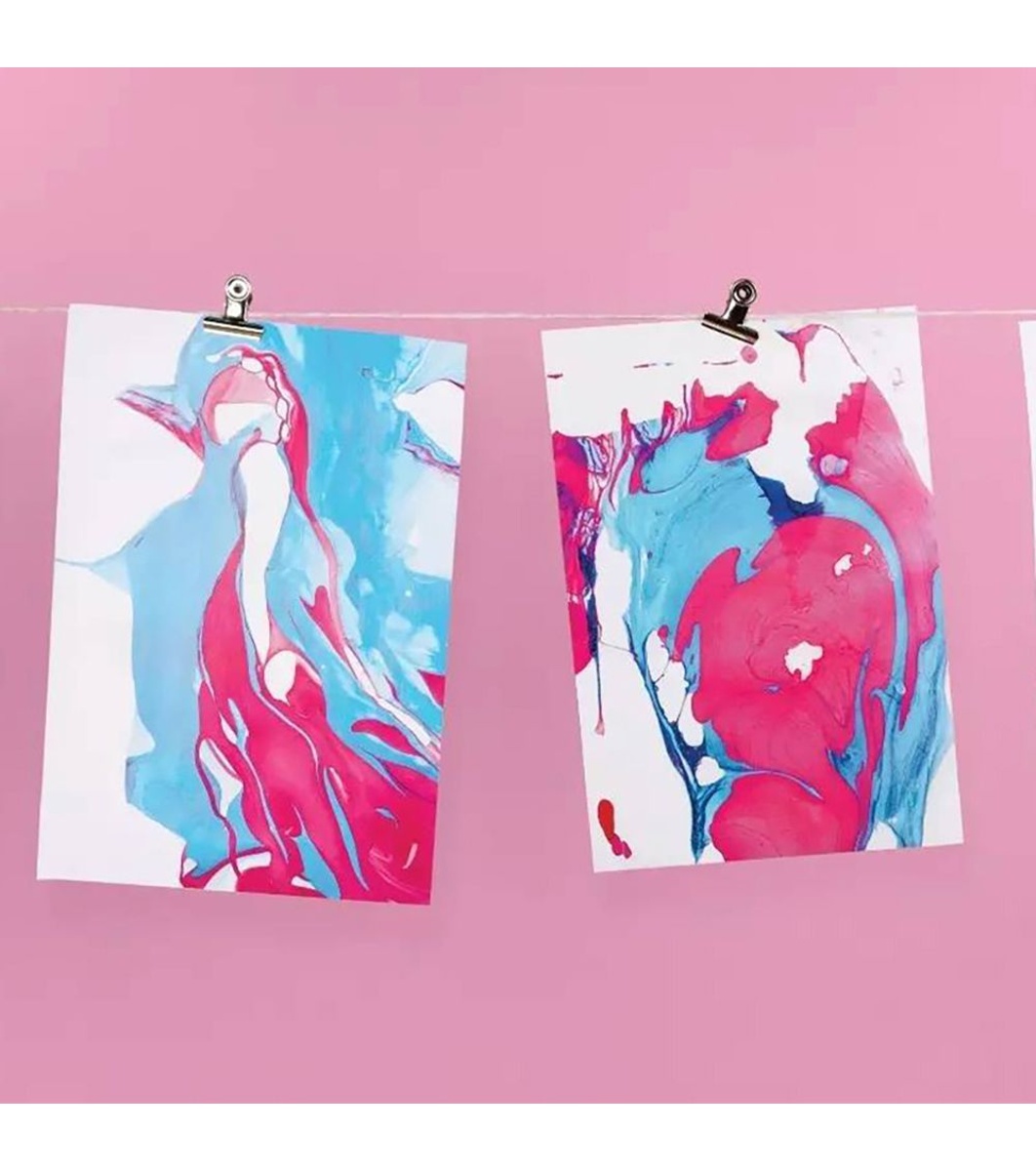 Mod de utilizare: Ceea ce se cere de la micile lucrări este să toarne în tava de plastic special concepută, pudră magică și apă. Apoi toarnă câteva picături din vopselele colorate care îți plac cel mai mult. Folosind paiele incluse în kit, creează modele și desenează figuri după preferințele tale.. realizați o bucată de hârtie marmorată pe suprafața recipientului și transferați creația pe ea. Cu ajutorul acestui tip de activitate creativă, copiii dezvoltă cunoștințele florale și artistice ale copiilor, precum și le îmbunătățesc semnificativ imaginația și creativitatea. Pictura magică este potrivită pentru diverse materiale, cum ar fi hârtie, ipsos, lemn, piatră și altele.