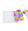 Ceea ce se cere de la micile lucrări este să turnați pudră magică și apă într-o tavă specială din plastic. Apoi turnați câteva picături din vopselele colorate care vă plac cel mai mult. Folosind paiele incluse in set, creeaza modele si deseneaza forme dupa bunul plac. Faceți o bucată de hârtie de marmură pe suprafața recipientului și transferați creația pe ea.