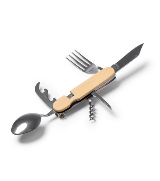 Set de tacâmuri multifuncționale cu construcție din bambus și accesorii din oțel inoxidabil.