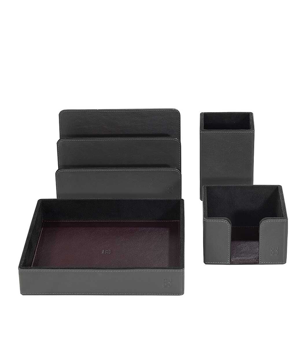 DuDu Set organizator de birou din piele în gri închis Răsfățați-vă sau cuiva iubit cu un set de birou din piele, un articol esențial pentru a vă decora cu stil biroul și pentru a vă menține în ordine articolele de papetărie.
