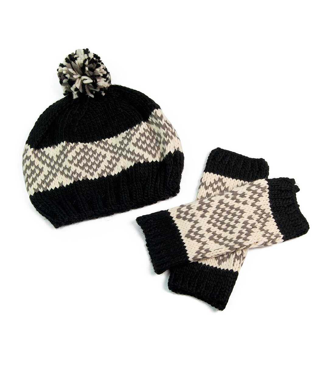 ART of POLO Set pălărie și mănuși pentru femei în negru și ecru Pălărie cu pompon