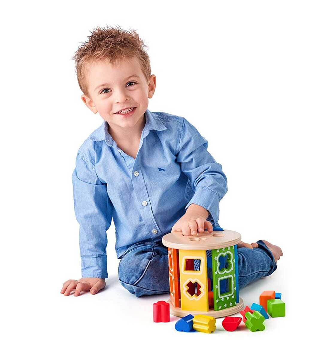 O opțiune excelentă este un sortator din lemn colorat, cu șase laturi colorate diferit, fiecare cu două găuri și o bază cu trei găuri.