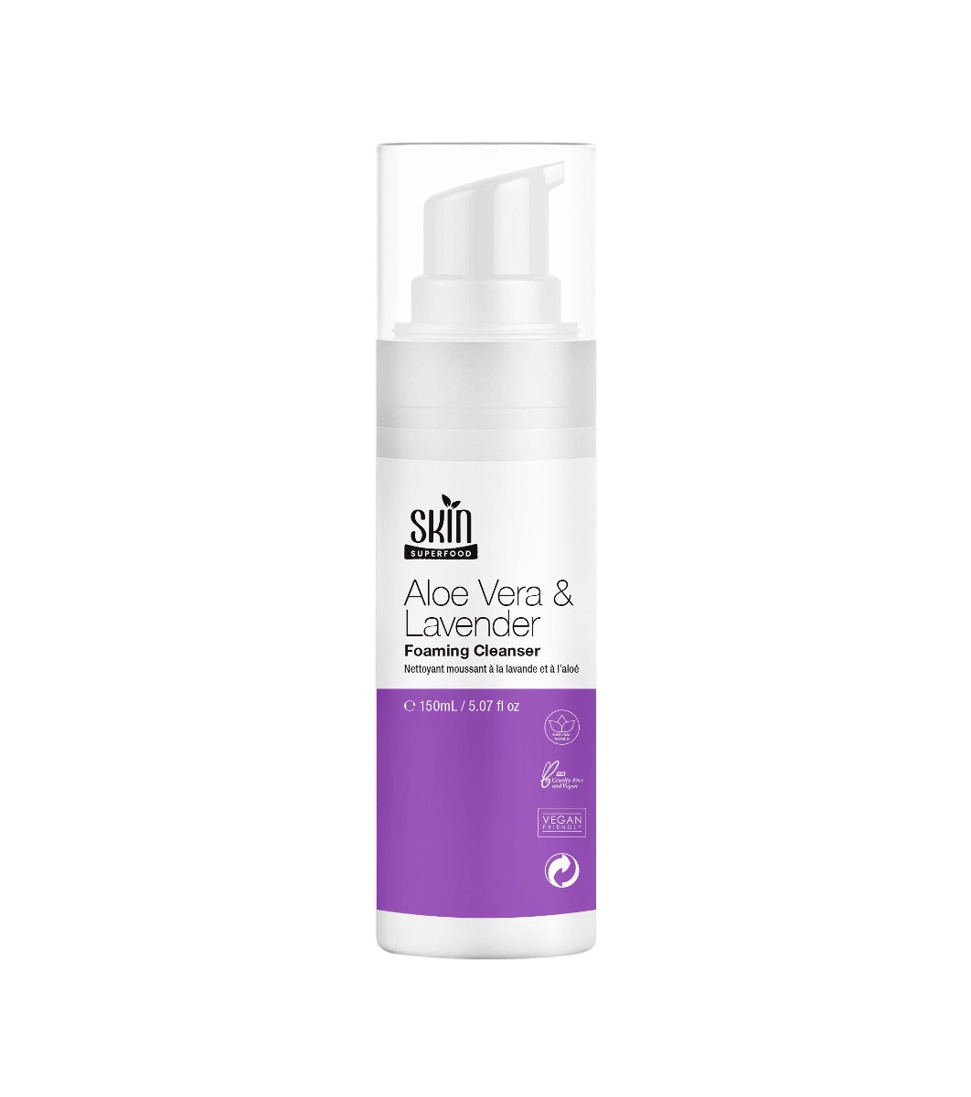Skin Superfood Spumă de curățare cu Aloe Vera și Lavandă 150 ml • Spumă delicată de curățare facială cu 97,92% ingrediente naturale. • La contactul cu pielea, textura lichidă se transformă într-o spumă bogată care îndepărtează murdăria, excesul de sebum, particulele fine din mediu, reziduurile de machiaj și alte impurități.