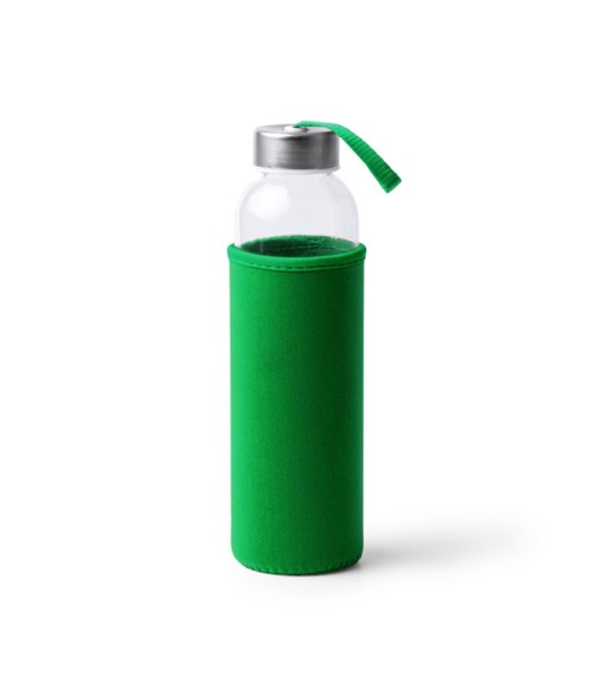 Sticlă cu o capacitate de 500 ml și corp din neopren, combinată cu o curea de transport colorată.