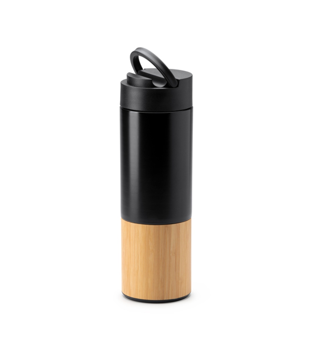 Stamina Sticlă de apă neagră cu detalii din bambus Coiba 450 ml Termos cu pereți dubli din oțel inoxidabil cu detalii din bambus.