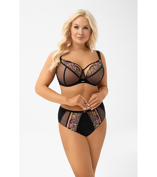 Partea superioară a cupelor este confecționată din material tip plasă cu broderie florală colorată.