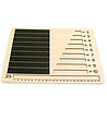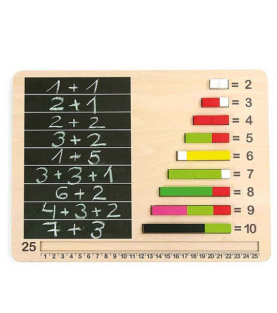 Setul include două plăci de lemn gravate pentru plasarea și fixarea benzilor de fracții în timpul jocului. În acest fel, copilul va exersa funcții matematice de bază și numeroase exerciții.