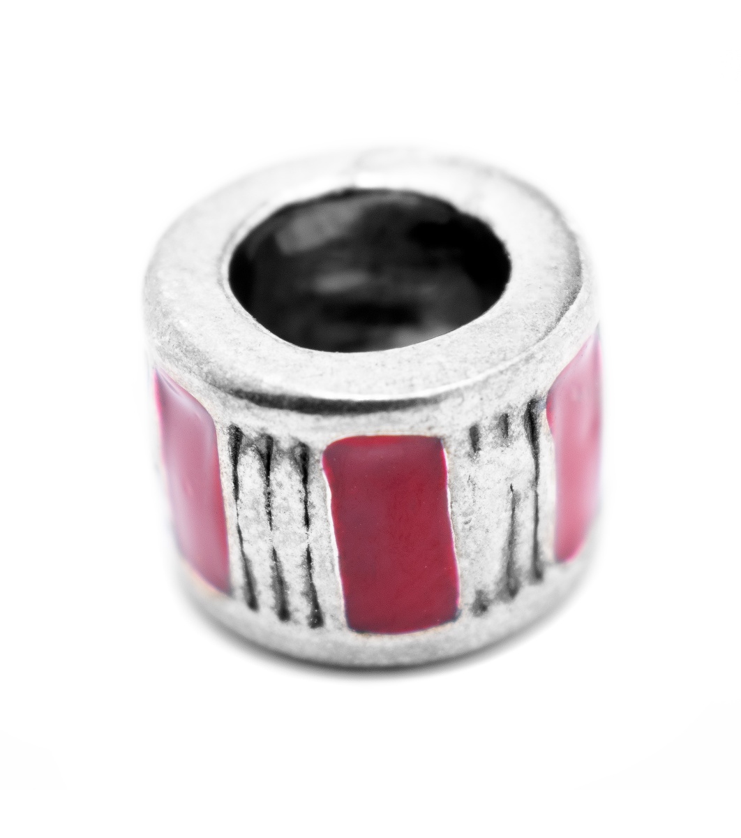 Element decorativ cu formă cilindrică și design geometric. Potrivit pentru a fi purtat ca ornament la o brățară sau un colier.