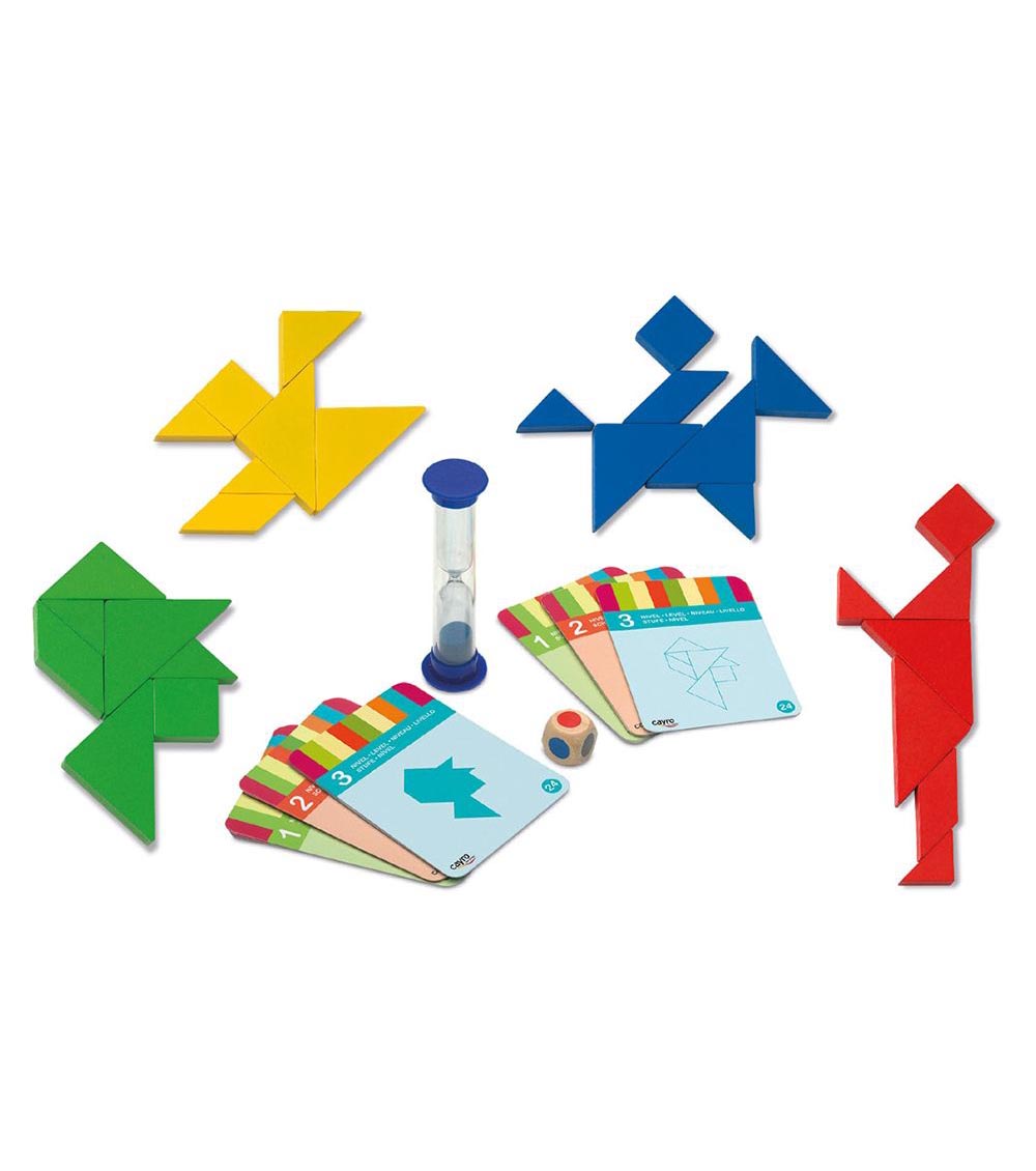În set vei găsi 4 tangrame, fiecare într-o culoare diferită, astfel încât să poată juca până la patru jucători.
