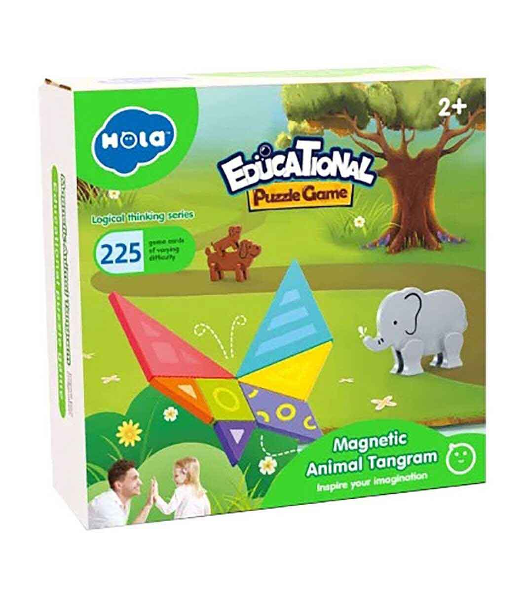 Creați peste 225 de situații cu acest tangram. Broșura prezintă diferite variante în care puteți include animalele din set. Creați o casă în care să stea în fața, un pod pe care să o traverseze sau o ușă prin care să intre. Ajutați-vă copilul să-și îmbunătățească gândirea abstractă și abilitățile de rezolvare a problemelor, permițându-i să aranjeze puzzle-uri cu forme geometrice cu tangramul magnetic pentru copii de la Hola. Setul conține 7 forme de tangram, 3 figuri de animale și o broșură de instrucțiuni. În timp ce se joacă și se distrează, copiii mici își vor dezvolta abilitățile geometrice și gândirea logică pe măsură ce învață să creeze diferite figuri combinând diferite forme. Cu acest tangram, copiii se pot distra singuri sau cu prietenii. Jocul Tangram a fost creat în China și este unul dintre cele mai vechi jocuri din lume. Jocul conține șapte părți sau tenes. Au dimensiuni si forme diferite, dispuse intr-un anumit mod pentru a forma un patrat. Cele șapte părți ale unui tangram sunt: 5 triunghiuri de dimensiuni diferite, un pătrat și un paralelogram. Aceste șapte părți ar trebui să le folosiți și să creați diferite forme. Urmăriți cum piesele de tangram își schimbă în mod magic forma încetul cu încetul, transformându-se într-una nouă. Jocul de logică Tangram este o modalitate perfectă de a-ți învăța copiii să fie mai concentrați, concentrați, mai pricepuți, să gândească logic și să-și îmbunătățească creativitatea și imaginația. Oferă-le plăcere și distracție de care, fără îndoială, se vor îndrăgosti.