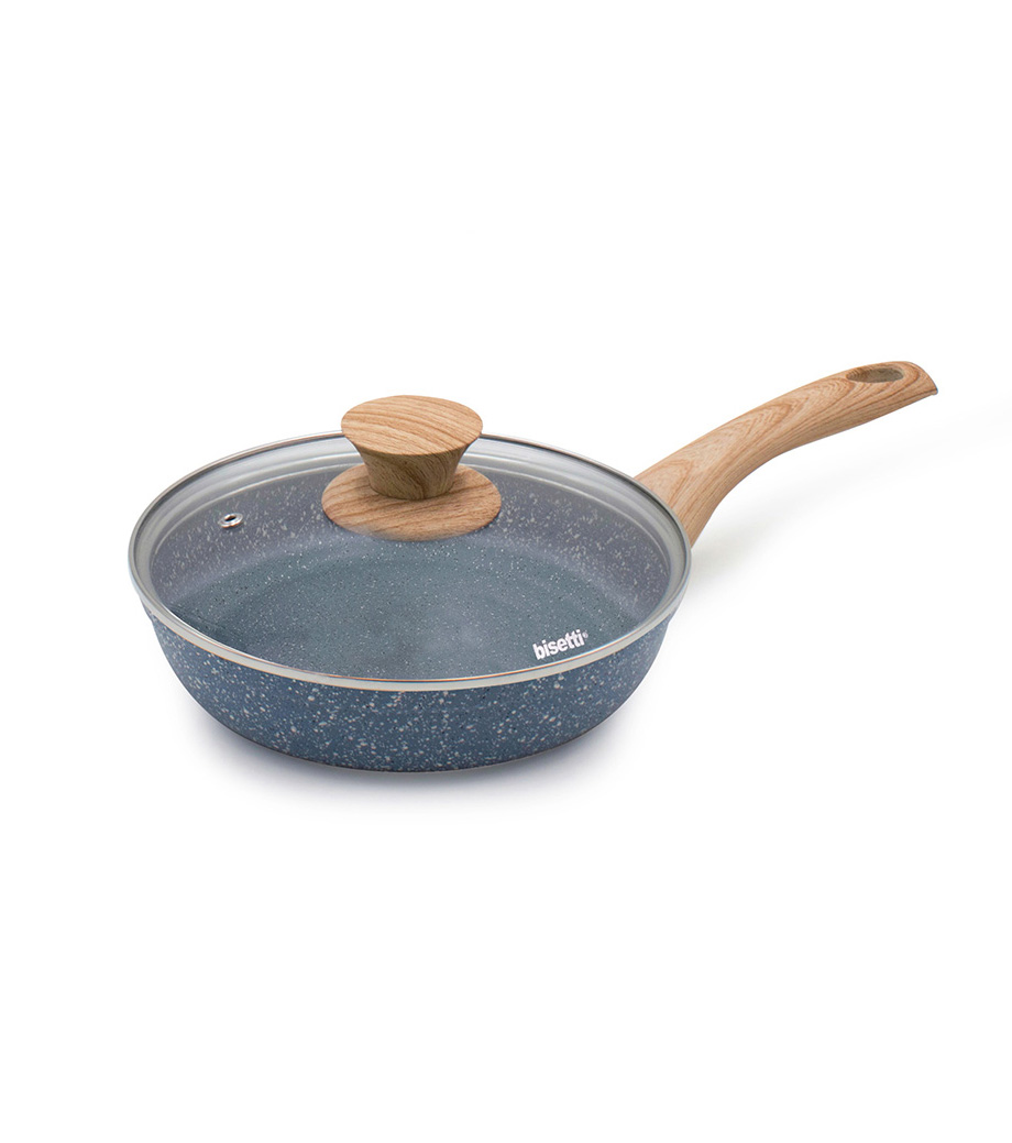 bisetti Italy Tigaie antiaderentă Pierre Gourmet cu capac 20 cm Acoperirea vaselor de gătit este compusă din minerale care creează o suprafață de gătit egală cu piatra reală.