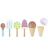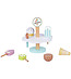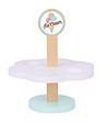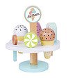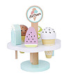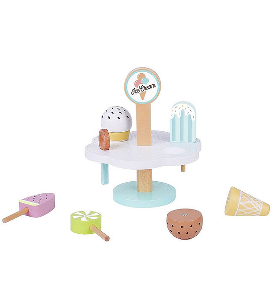 Cinci cornete de înghețată din lemn, cu diferite arome și forme, precum și o linguriță mică, așezate pe un stand spectaculos, vor oferi ore întregi de jocuri distractive și bună dispoziție.
