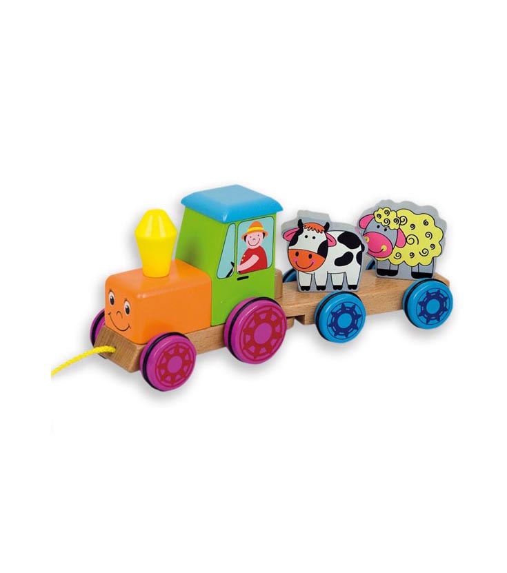 Fermă din lemn cu animale, remorcă și magnet. Jucăria este un tractor cu o remorcă pe care sunt două animale atașate la remorcă prin intermediul unor magneți. Există 3 elemente în set.