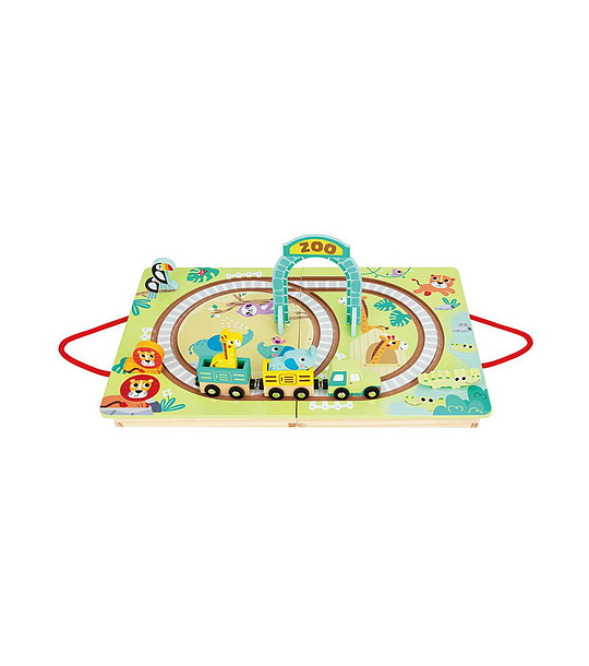 Frumoasa valiză din lemn devine un decor cu șine, de-a lungul căruia va alerga vesel roller coasterul Zoo. Un papagal, un leu, o girafă, un elefant, un crocodil, două vagoane, o locomotivă și arcul grădinii zoologice moartă în valiză și așteaptă să fie reînviați de imaginația unui copil.