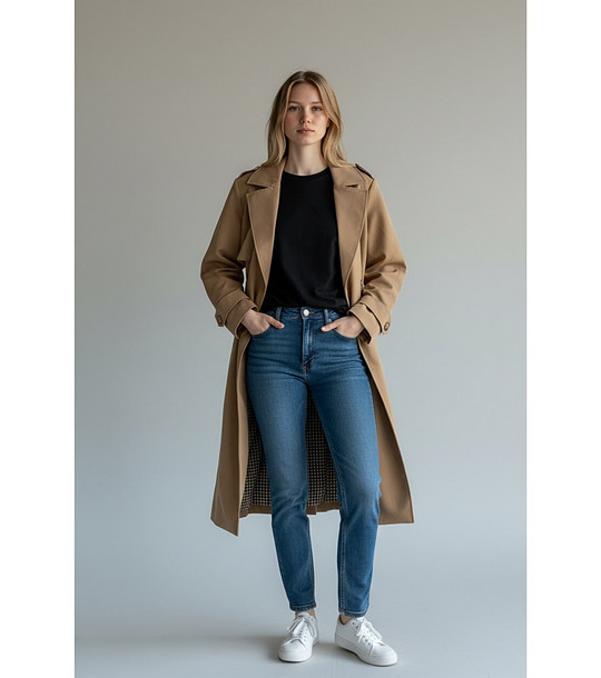 Trench lung, cu două rânduri de nasturi, cu siluetă dreaptă.