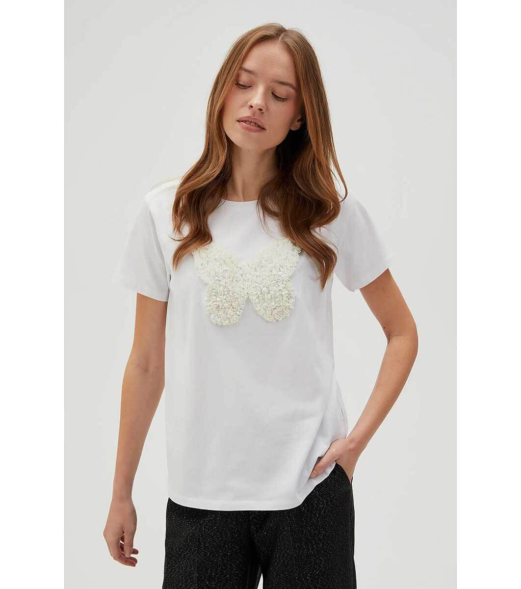 Moodo Tricou alb de damă din bumbac cu fluture Decolteu rotund