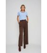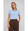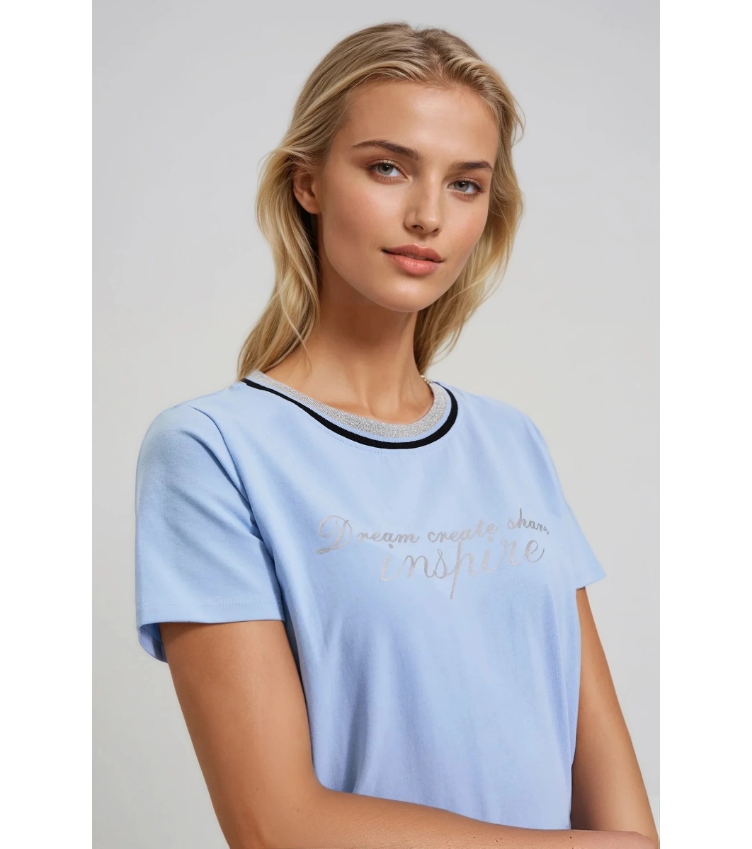 Tricou de damă cu mânecă scurtă, cu decolteu rotund și margine contrastantă. Inscripție cu efect decorativ pe față. Siluetă dreaptă, lungime până la șold.