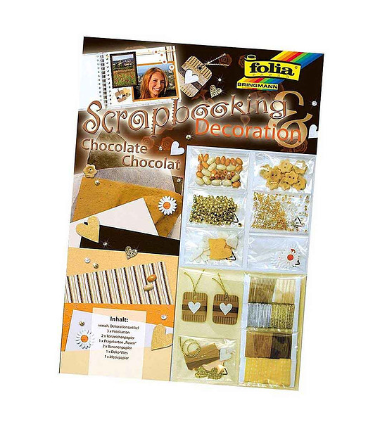 Folia Trusă pentru albume, ciocolată Kit de aplicații creative și scrapbooking,  potrivit pentru realizarea diverselor obiecte decorative, precum și pentru albume foto originale. Setul include: 3 buc. cutii de carton;  1 buc. carton gofrat cu flori; hârtie de designer cu ornamente; 3 buc. hârtie subțire de diferite texturi și culori; diverse elemente decorative - panglici, nasturi, margele, pandantive etc.