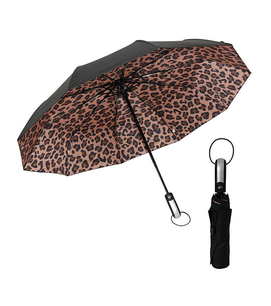 Umbrelă pliabilă neagră cu imprimeu leopard pe partea inferioară