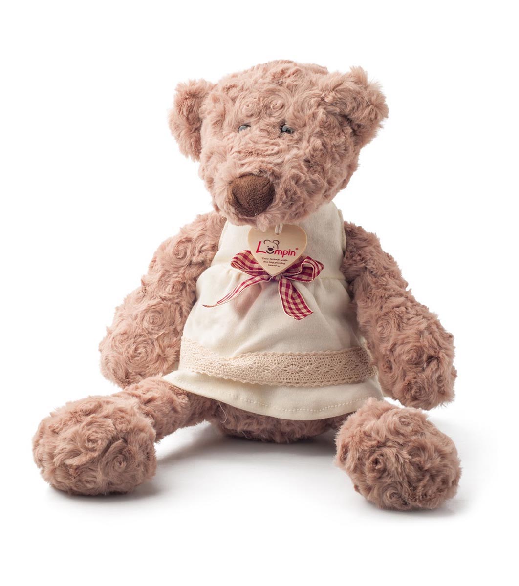 Jucăria are ochii prinși în siguranță și un pandantiv din material textil cu logo-ul de brand Lumpin.