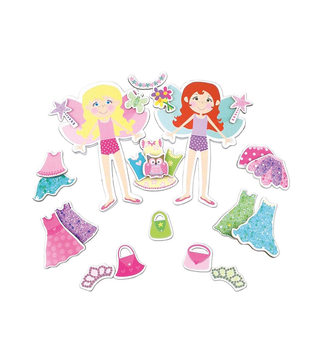 Conținut: 2 păpuși zâne magnetice, 22 articole de îmbrăcăminte și accesorii magnetice.