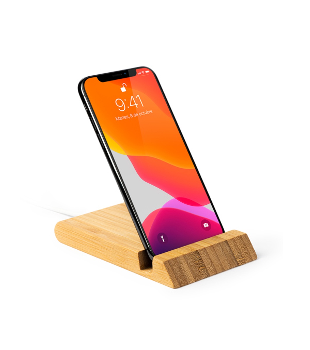 Încărcător wireless cu suport pentru telefoane mobile și tablete, fabricat din bambus.