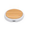 Încărcător wireless fabricat cu carcasă ABS albă și suprafață din bambus, cu o putere de 5W.