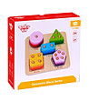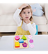 Setul include o tabla de lemn pe care trebuie sortate si insirate diferitele forme, iar copilul trebuie sa aseze figurinele astfel incat gaurile acestora sa se potriveasca pe frigaruile care ies din tabla.