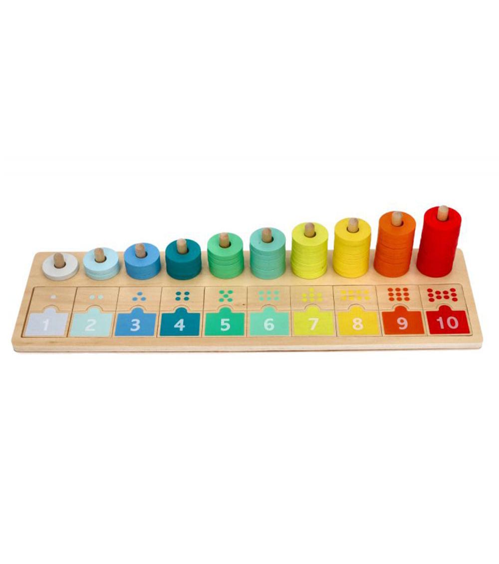 Există 10 cuie de care puteți înșira șaibele din lemn. Cuiele sunt de o asemenea lungime, încât atunci când pucurile sunt aliniate, copiii pot număra de la 1 la 10, în funcție de care este poziția.