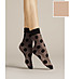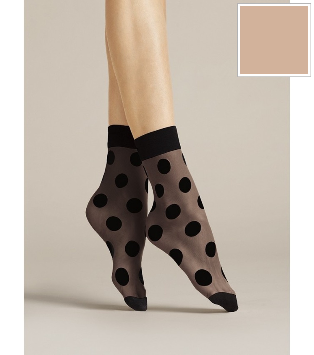 Șosete translucide cu model figurat, cu margine superioară elastică lată, fără strângere. Partea din față a piciorului și a degetelor întărite. Decorate cu un motiv cu buline mari pe toată lungimea.