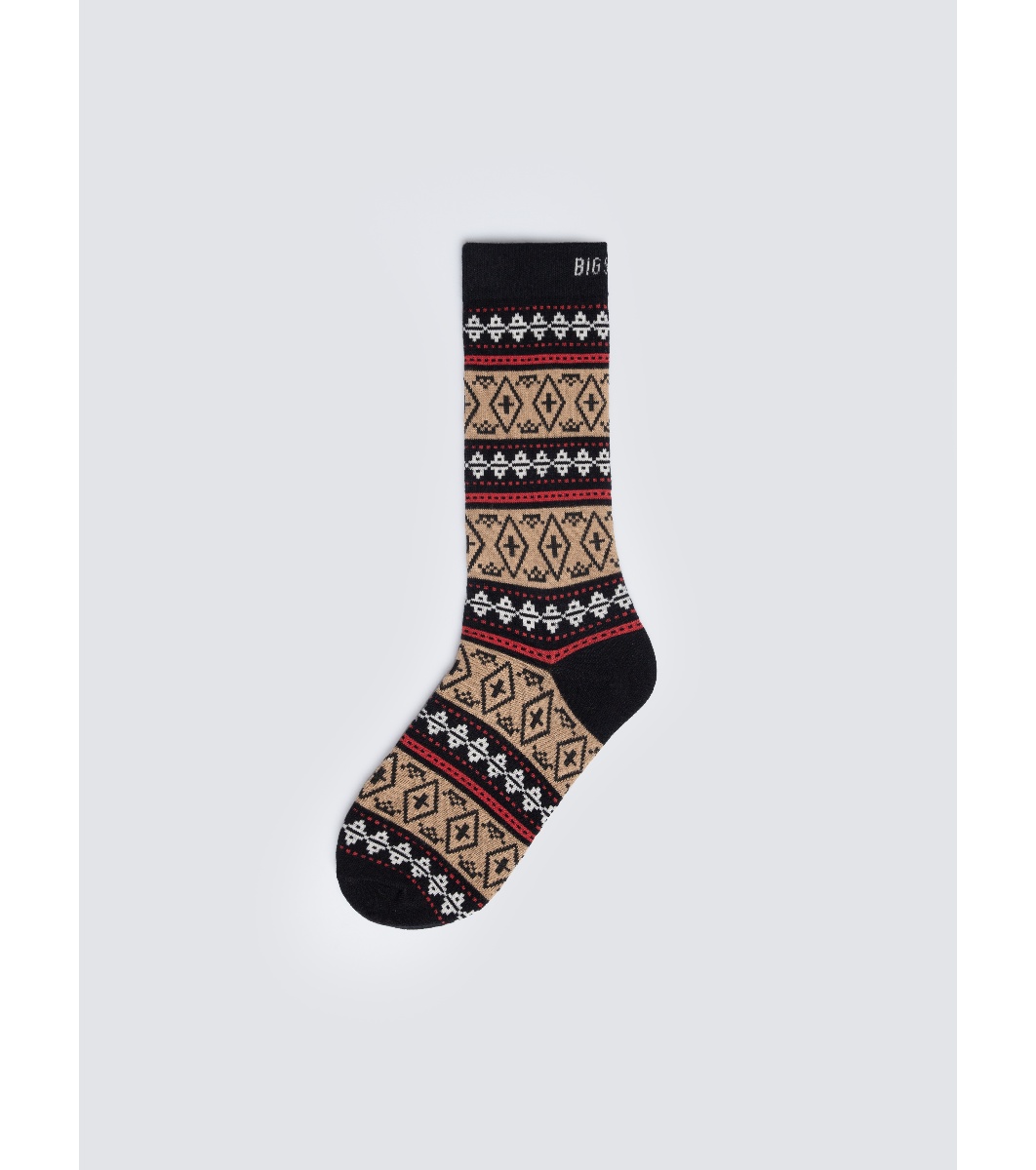 Șosete lungi cu model geometric țesut cu romburi și ornamente. Partea superioară și vârfurile contrastante. Margine elastică lată în partea de sus.