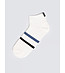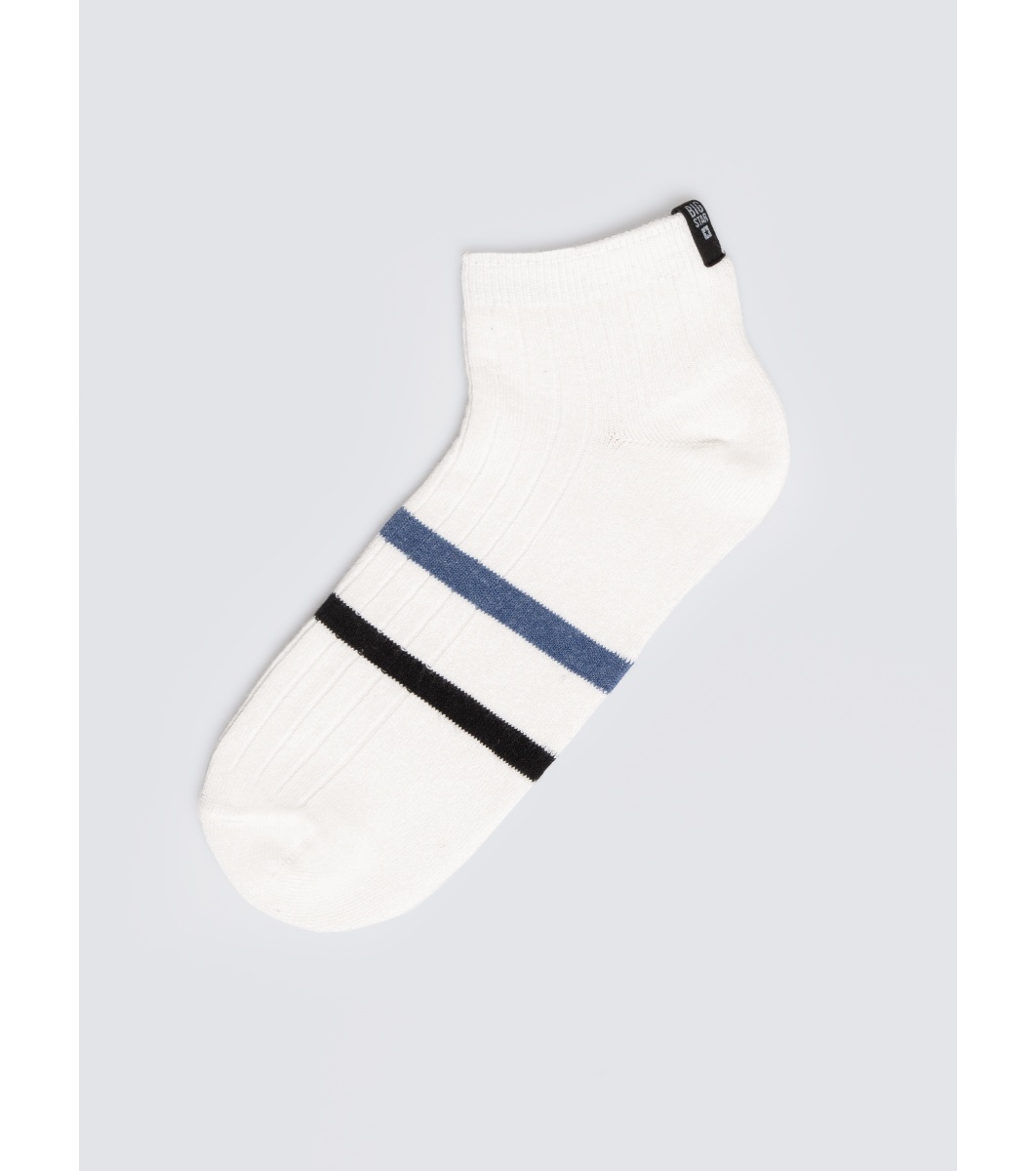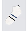 Șosete scurte bărbătești cu o linie joasă deasupra gleznei. Modelul are o structură cu nervuri și două dungi orizontale contrastante pe față. Există o mică etichetă cu un logo deasupra elasticului.